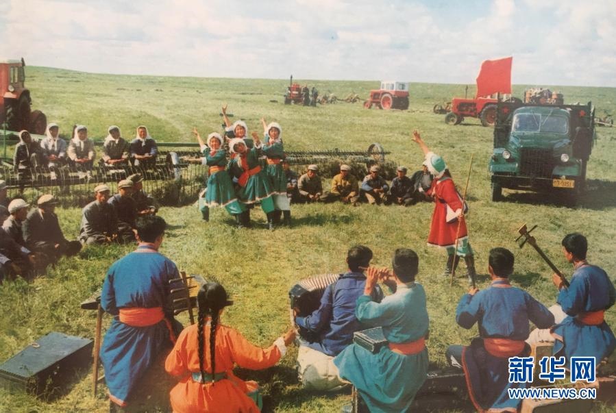 20世紀(jì)七十年代,錫林郭勒盟烏蘭牧騎隊員在草原上為牧民演出(資料照片)。新華社發(fā)