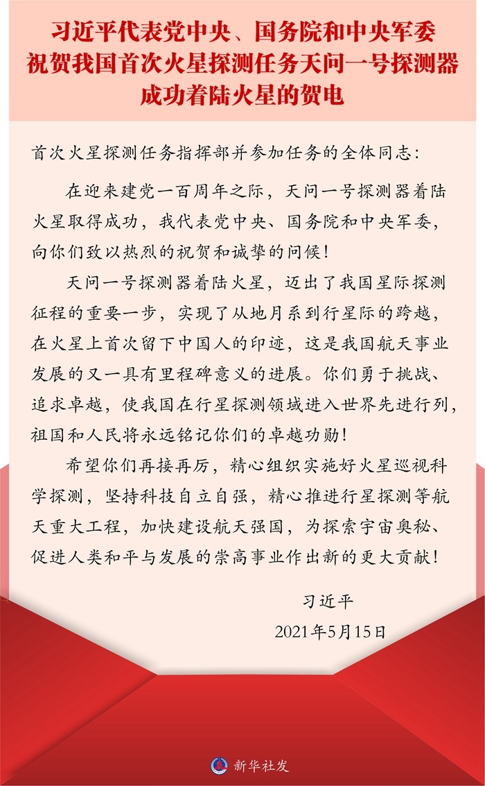 在迎來建黨一百周年之際,天問一號探測器著陸火星取得成功,我代表黨中央、國務(wù)院和中央軍委,向你們致以熱烈的祝賀和誠摯的問候!