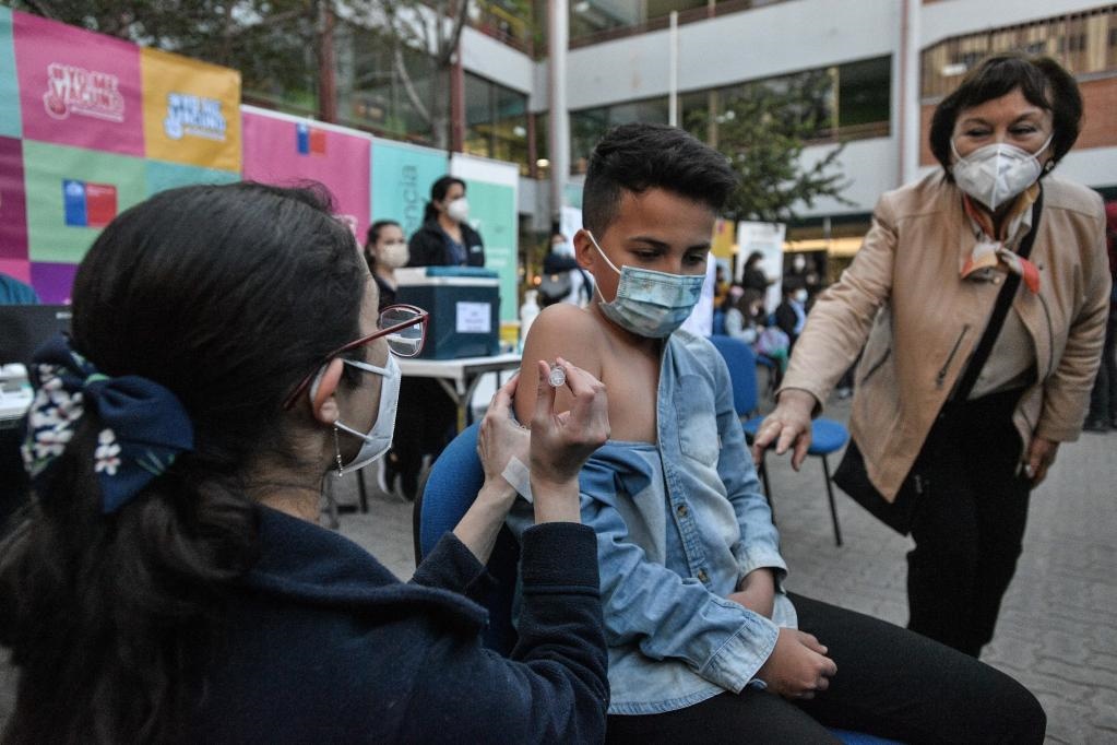 2021年9月27日,一名兒童在智利首都圣地亞哥接種科興新冠疫苗。27日起,智利開始對6歲至11歲在校學(xué)生接種中國科興疫苗。