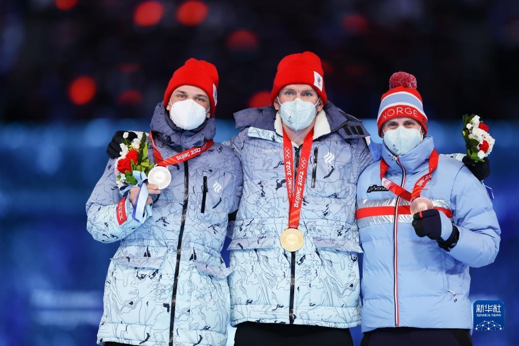 這是越野滑雪男子50公里集體出發(fā)(自由技術(shù))冠軍俄羅斯奧委會(huì)選手亞歷山大·博利舒諾夫(中)、亞軍俄羅斯奧委會(huì)選手伊萬(wàn)·亞基穆什金(左)和季軍挪威選手西蒙·赫格斯塔德·克呂格爾在獎(jiǎng)牌頒發(fā)儀式上。