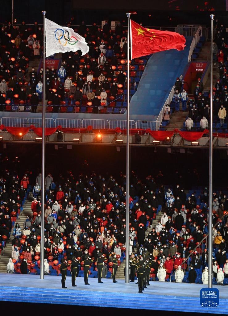 這是奧林匹克會(huì)旗與中華人民共和國(guó)國(guó)旗在閉幕式上飄揚(yáng)。