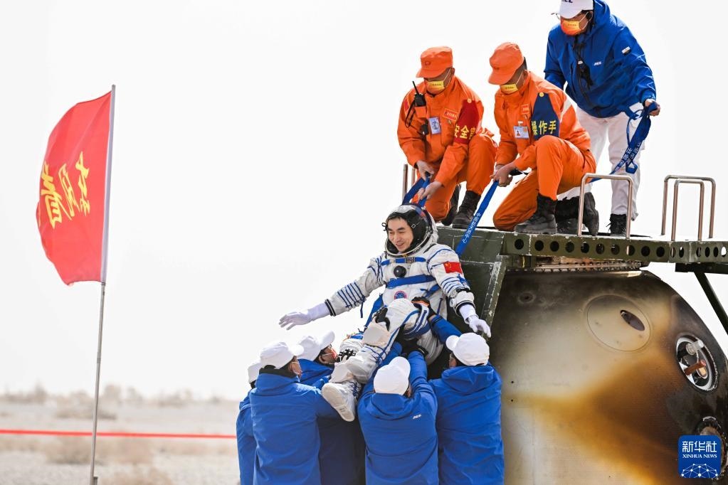 9時(shí)6分,北京航天飛行控制中心通過地面測(cè)控站發(fā)出返回指令,神舟十三號(hào)載人飛船軌道艙與返回艙成功分離。9時(shí)30分,飛船返回制動(dòng)發(fā)動(dòng)機(jī)點(diǎn)火,返回艙與推進(jìn)艙分離。返回艙成功著陸后,擔(dān)負(fù)搜救回收任務(wù)的搜救分隊(duì)及時(shí)發(fā)現(xiàn)目標(biāo)并第一時(shí)間抵達(dá)著陸現(xiàn)場。返回艙艙門打開后,醫(yī)監(jiān)醫(yī)保人員確認(rèn)航天員身體健康。載人航天工程空間站階段飛行任務(wù)總指揮部有關(guān)領(lǐng)導(dǎo)在東風(fēng)著陸場迎接航天員。