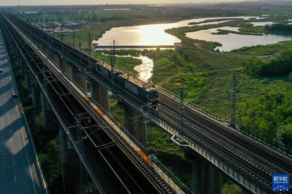 重載列車行駛在大秦鐵路上(2022年7月16日攝,無人機(jī)照片)。為做好迎峰度夏能源保供工作,中國鐵路太原局集團(tuán)有限公司在確保運輸安全的前提下全力提升煤炭運量。新華社記者曹陽攝