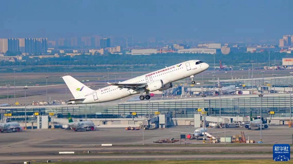 2022年5月14日6時52分,編號為B-001J的C919大飛機(jī)從上海浦東機(jī)場第4跑道起飛,于9時54分安全降落,標(biāo)志著中國商飛公司即將交付首家用戶的首架C919大飛機(jī)首次飛行試驗圓滿完成。新華社發(fā)