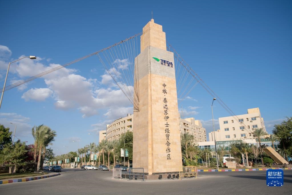 這是2021年1月14日在埃及蘇赫奈泉拍攝的中?!ぬ┻_(dá)蘇伊士經(jīng)貿(mào)合作區(qū)大門。新華社記者 鄔惠我 攝