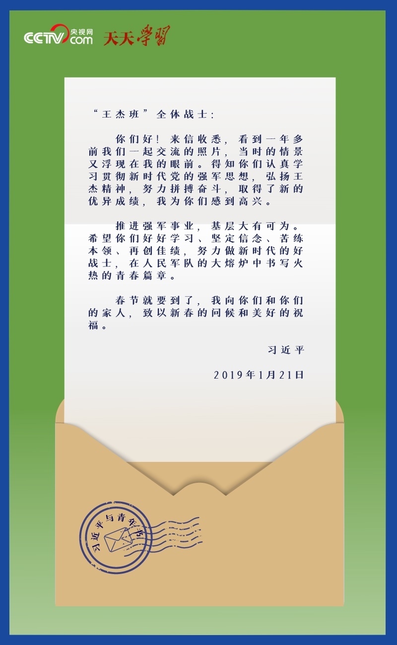 “你們好!來信收悉,看到一年多前我們一起交流的照片,當(dāng)時的情景又浮現(xiàn)在我的眼前。得知你們認(rèn)真學(xué)習(xí)貫徹新時代黨的強軍思想,弘揚王杰精神,努力拼搏奮斗,取得了新的優(yōu)異成績,我為你們感到高興……”