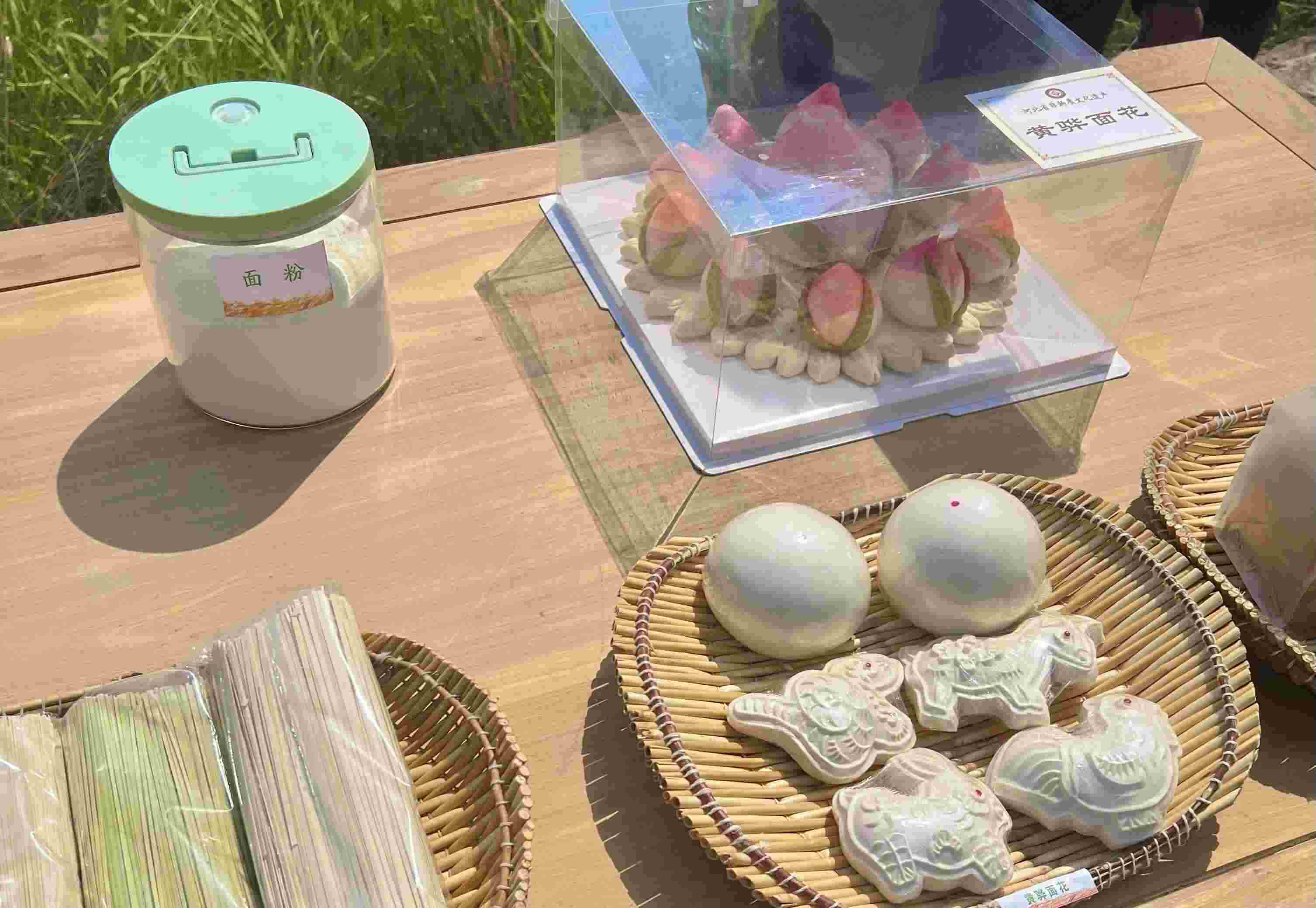 在楊東進(jìn)家麥田的路邊,擺放著一張長(zhǎng)方形的木桌。桌上擺放著用于展示的旱堿麥的植株和麥粒樣本,以及由旱堿麥制成的面粉、掛面、饅頭和黃驊面花等產(chǎn)品,總書記在這里駐足觀看。印刻著寓意吉祥圖案的黃驊面花,被列為省級(jí)非物質(zhì)文化遺產(chǎn)。