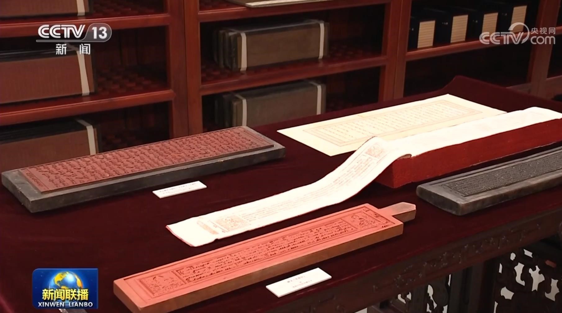 ▲圖為習(xí)近平總書(shū)記參觀的“漢藏蒙滿(mǎn)文大藏經(jīng)雕版合璧”庫(kù)展展品。