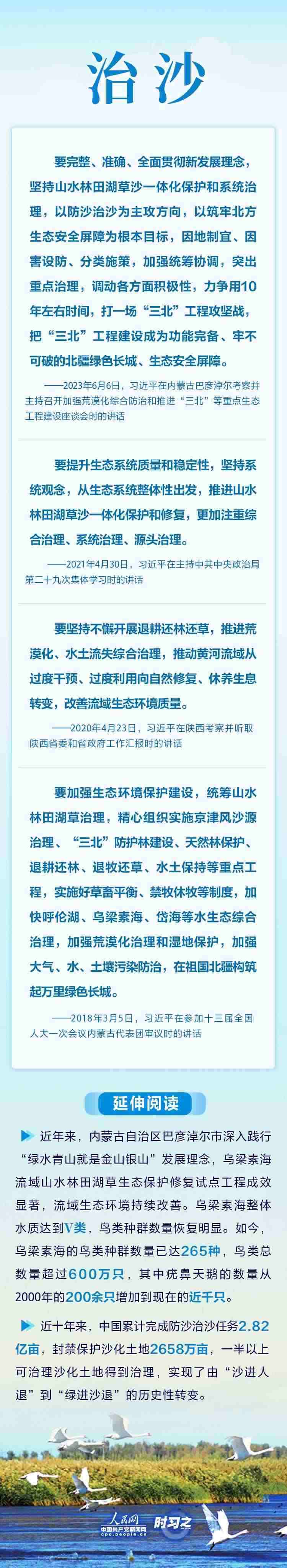 2023年6月5日至6日,中共中央總書記、國家主席、中央軍委主席習(xí)近平在內(nèi)蒙古自治區(qū)巴彥淖爾市考察,主持召開加強(qiáng)荒漠化綜合防治和推進(jìn)“三北”等重點(diǎn)生態(tài)工程建設(shè)座談會并發(fā)表重要講話。
