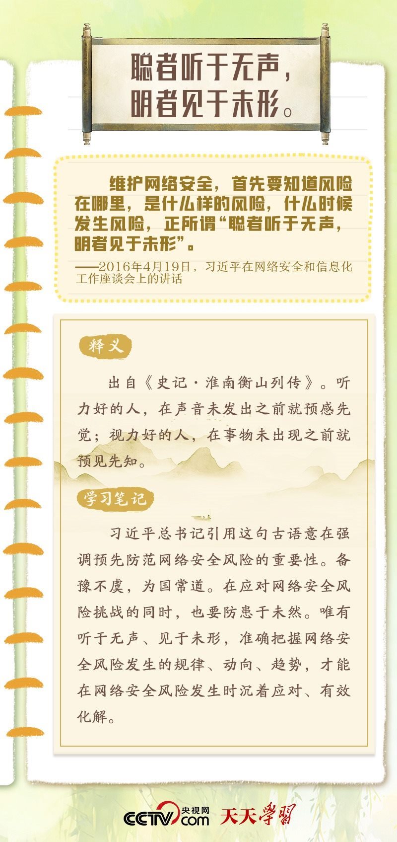 習(xí)近平總書記重視網(wǎng)絡(luò)安全工作,曾多次在講話中以典明理,深刻闡釋網(wǎng)絡(luò)安全工作的重要意義?!熬W(wǎng)絡(luò)安全宣傳周”到來之際,央視網(wǎng)《天天學(xué)習(xí)》特梳理總書記關(guān)于網(wǎng)絡(luò)安全的用典,與您一起學(xué)習(xí)領(lǐng)悟。