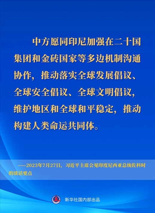 7月27日下午,國(guó)家主席習(xí)近平在成都會(huì)見(jiàn)來(lái)華出席第31屆世界大學(xué)生夏季運(yùn)動(dòng)會(huì)開(kāi)幕式并訪華的印度尼西亞總統(tǒng)佐科。一起來(lái)看習(xí)近平主席在會(huì)見(jiàn)時(shí)的談話要點(diǎn)↓