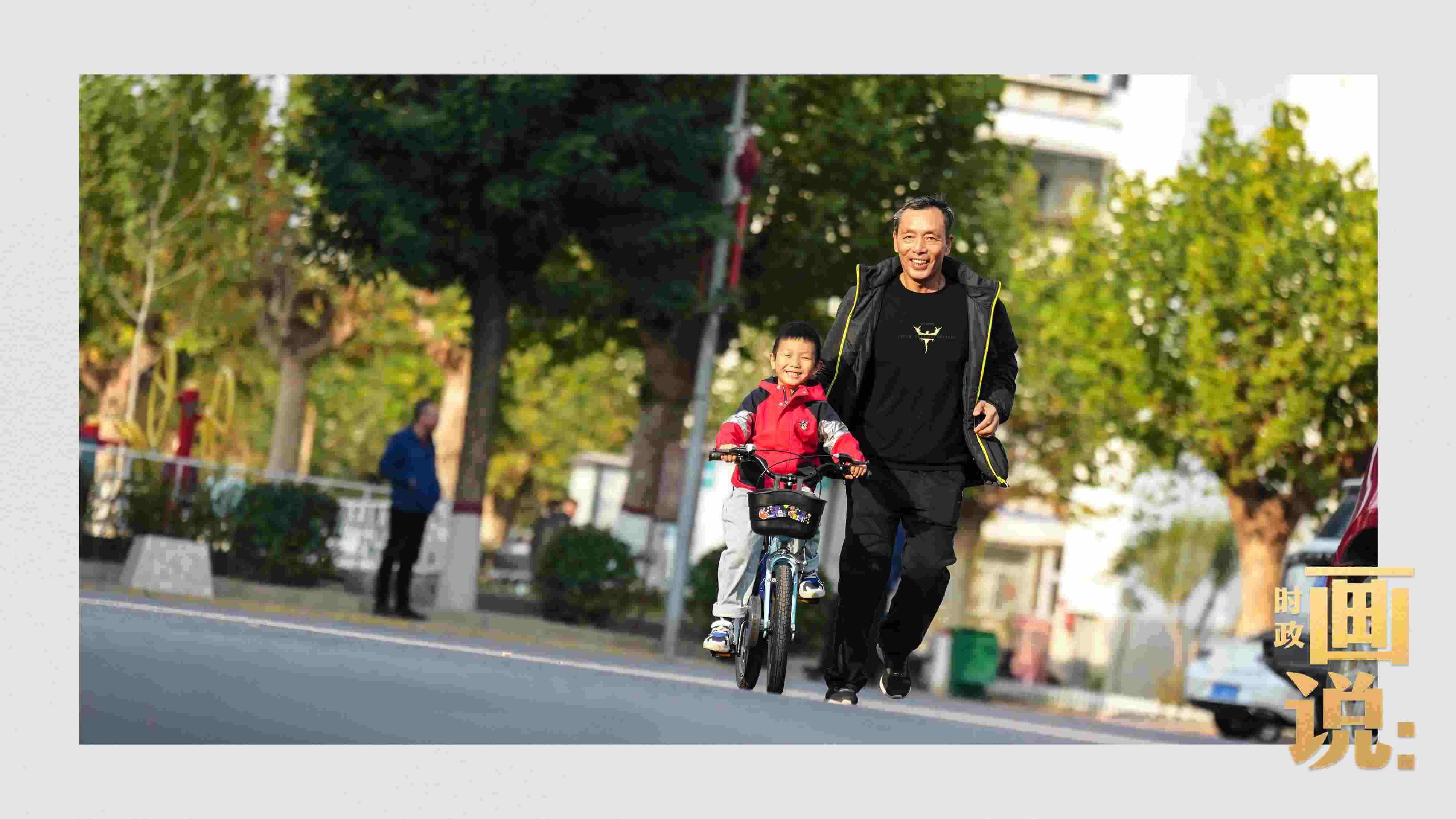 △學(xué)騎自行車的爺孫倆其樂融融。冬日的暖陽留在身上,會心的笑容掛在臉上。永濟(jì)秀園小區(qū),涿州。
