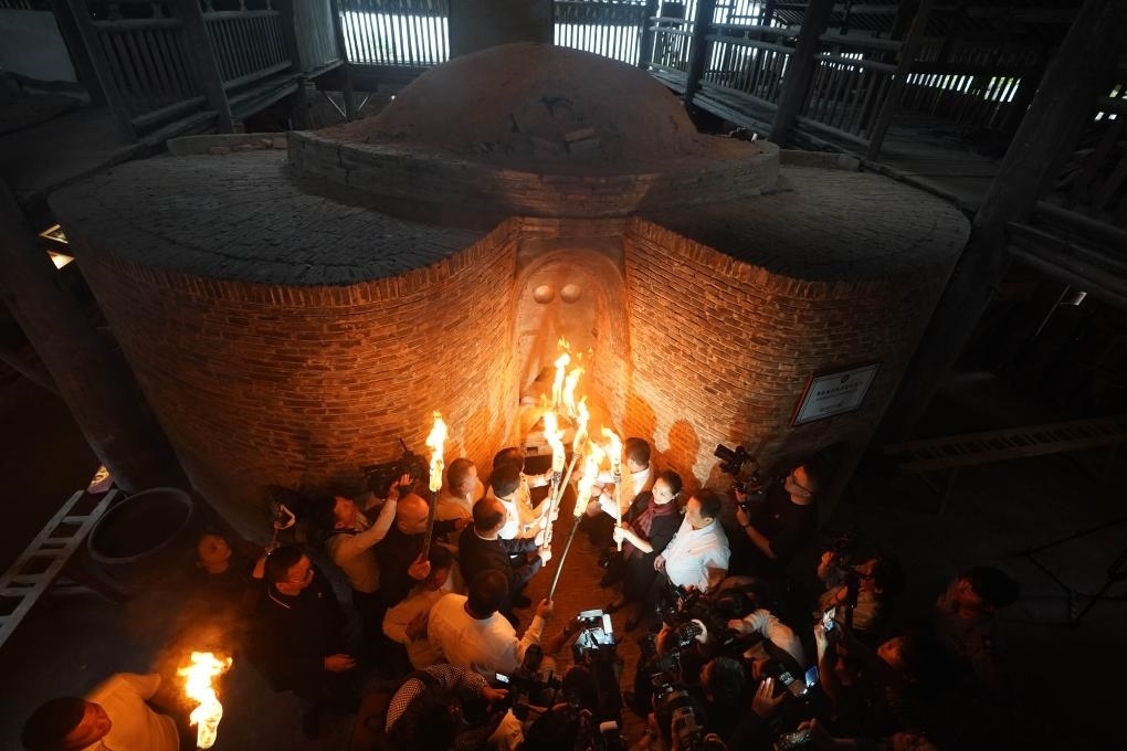 2023年10月19日,嘉賓與把樁師傅一起對葫蘆窯進(jìn)行復(fù)燒點(diǎn)火。當(dāng)日,作為2023中國景德鎮(zhèn)國際陶瓷博覽會的活動之一,景德鎮(zhèn)古窯民俗博覽區(qū)對重建的明代葫蘆窯進(jìn)行點(diǎn)火復(fù)燒。同時,景德鎮(zhèn)歷代瓷窯活態(tài)傳承紀(jì)實(shí)館開館。新華社記者 周密 攝