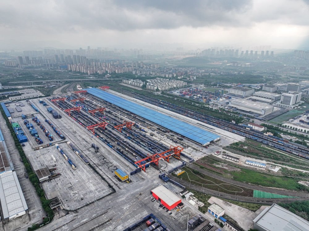 2022年6月23日,中歐班列(重慶)第10000列列車(chē)在重慶團(tuán)結(jié)村中心站等待發(fā)車(chē),即將奔赴德國(guó)杜伊斯堡(無(wú)人機(jī)照片)。
