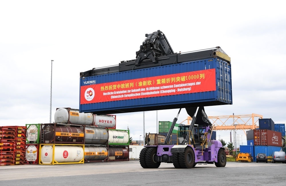 2022年7月11日,中歐班列(重慶)第10000列重箱折列抵達(dá)德國(guó)杜伊斯堡,這是接車(chē)儀式現(xiàn)場(chǎng)。