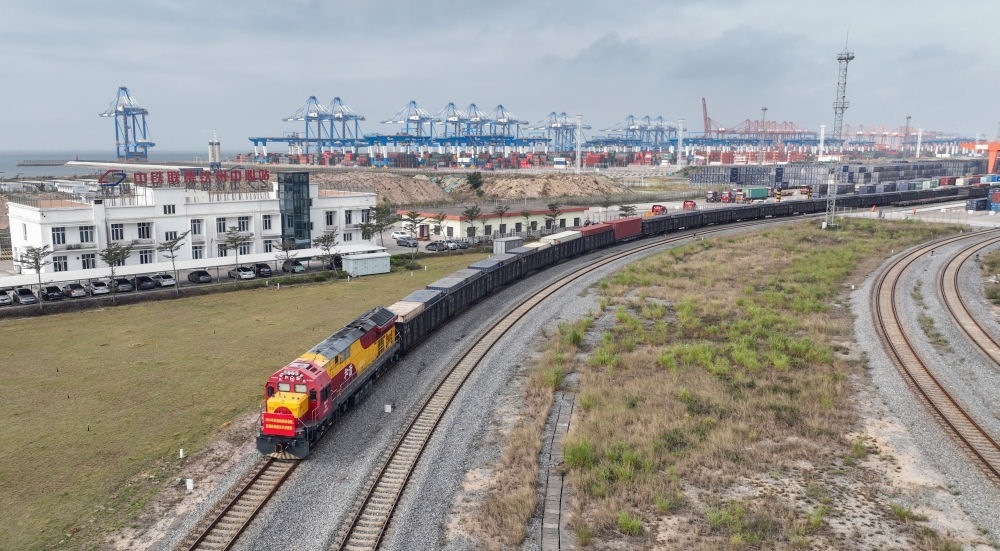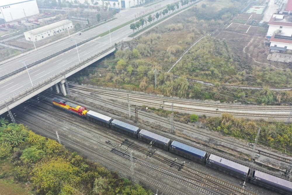 2023年1月22日,一趟西部陸海新通道鐵海聯(lián)運(yùn)班列從重慶團(tuán)結(jié)村中心站發(fā)車(chē)(無(wú)人機(jī)照片)。班列滿載著汽車(chē)、摩托車(chē)、發(fā)動(dòng)機(jī)和純堿等共計(jì)100個(gè)集裝箱的貨物,將經(jīng)廣西欽州港換乘海船去往印度尼西亞、菲律賓、喀麥隆、澳大利亞等國(guó)家和地區(qū)。