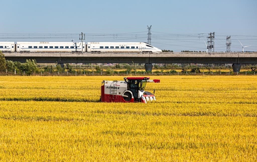 △2024年9月18日,黑龍江省哈爾濱市阿城區(qū)料甸街道三家子屯,農(nóng)民正在收割水稻。