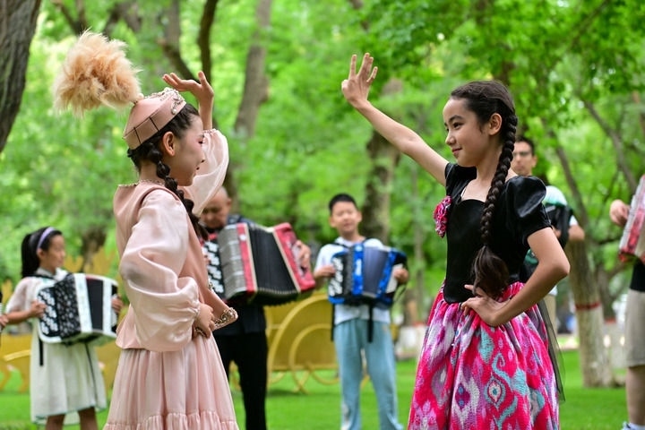 在新疆塔城市文化廣場(chǎng),練習(xí)手風(fēng)琴的孩子隨著琴聲翩翩起舞(2024年7月24日攝)。新華社記者 丁磊 攝