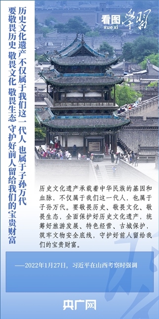 文化遺產(chǎn)是中華優(yōu)秀傳統(tǒng)文化的重要載體,承載著中華民族的基因和血脈。做好歷史文化遺產(chǎn)保護(hù)傳承工作,習(xí)近平總書記強(qiáng)調(diào),要統(tǒng)籌好旅游發(fā)展、特色經(jīng)營(yíng)、古城保護(hù),筑牢文物安全底線,守護(hù)好前人留給我們的寶貴財(cái)富。