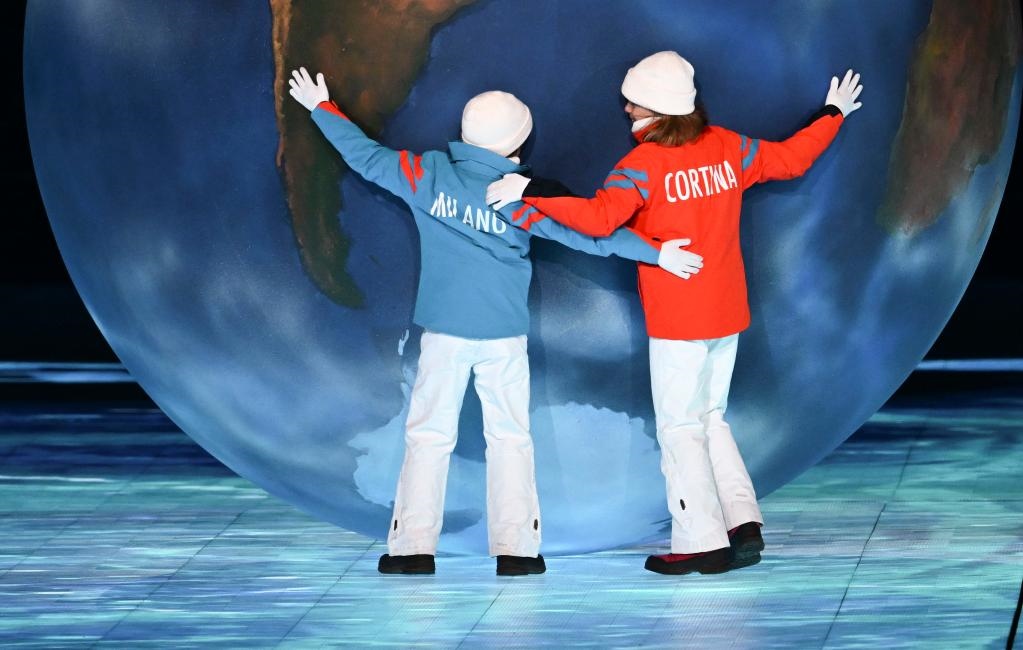 循著場地邊緣一道亮光,兩位意大利小朋友推動手工制作的地球走向中央。下一屆冬奧會舉辦地八分鐘表演“雙城璧合·聚力聯(lián)輝”拉開序幕。四年后,活力四射的時尚之都米蘭將攜手山川環(huán)繞的科爾蒂納丹佩佐,共襄冬奧盛會。山川與城市、自然與建筑相互映照,在共舞中寄寓著人類和自然間的彼此尊重、相互對話。