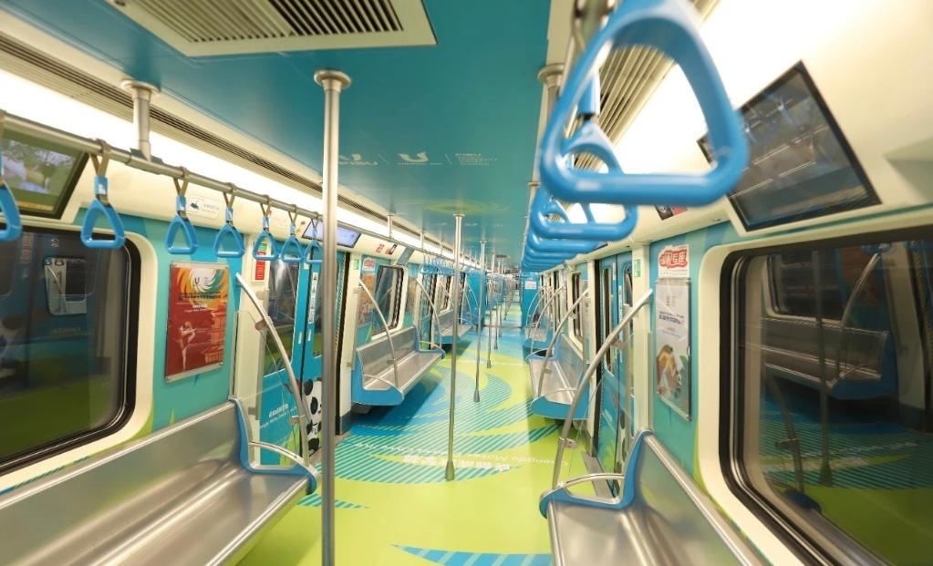 整體車廂打造創(chuàng)新植入了色彩明快、充滿青春氣息的“移動運(yùn)動場”概念,立面畫面則結(jié)合青春動感的大學(xué)生形象,并選用田徑、網(wǎng)球、籃球、體操等運(yùn)動的代表性動作為設(shè)計元素,全面凸顯成都大運(yùn)會賽事核心主題。