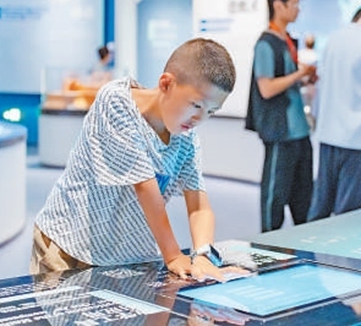 陜西歷史博物館秦漢館,游客在體驗(yàn)互動(dòng)裝置。施 覺攝