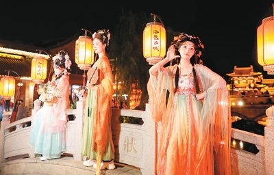 洛邑古城相關(guān)負(fù)責(zé)人介紹,景區(qū)致力于漢服文化的推廣與傳承,創(chuàng)意打造穿越新場景,豐富文旅新業(yè)態(tài)。景區(qū)有24個朝代的漢服形制、56個民族的服飾款式,游客可找到各自喜歡的款式,扮演喜愛的角色。燈獅畫橋、香羅幔天、文峰暮鼓等30余處場景,讓游客盡享“穿越自由”。洛邑古城還策劃了一系列創(chuàng)新主題活動,讓身著漢服的游客與“李白”“武則天”談古論今,與“嫦娥”“牡丹花神”近距離互動。