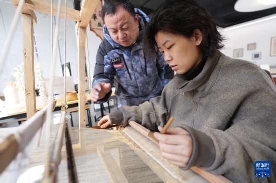 2月19日,柯翔祥(左)在德清莫干山鎮(zhèn)由蠶種場(chǎng)改造的絲綢技藝展示館給從西安前來(lái)研學(xué)的大學(xué)生介紹緙絲技術(shù)。