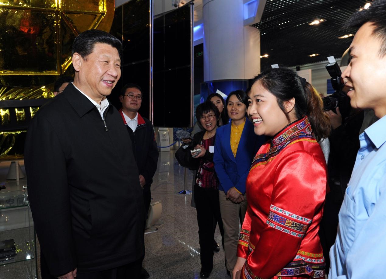 2013年5月4日,習(xí)近平和在中國(guó)空間技術(shù)研究院展廳參觀的各界優(yōu)秀青年代表交談。來(lái)源:新華社