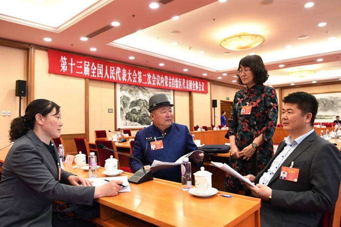 3月12日,內(nèi)蒙古代表團的4名基層代表在全團會議結(jié)束后,仍在熱議“兩高”報告。 內(nèi)蒙古日報社融媒體記者 袁永紅 攝