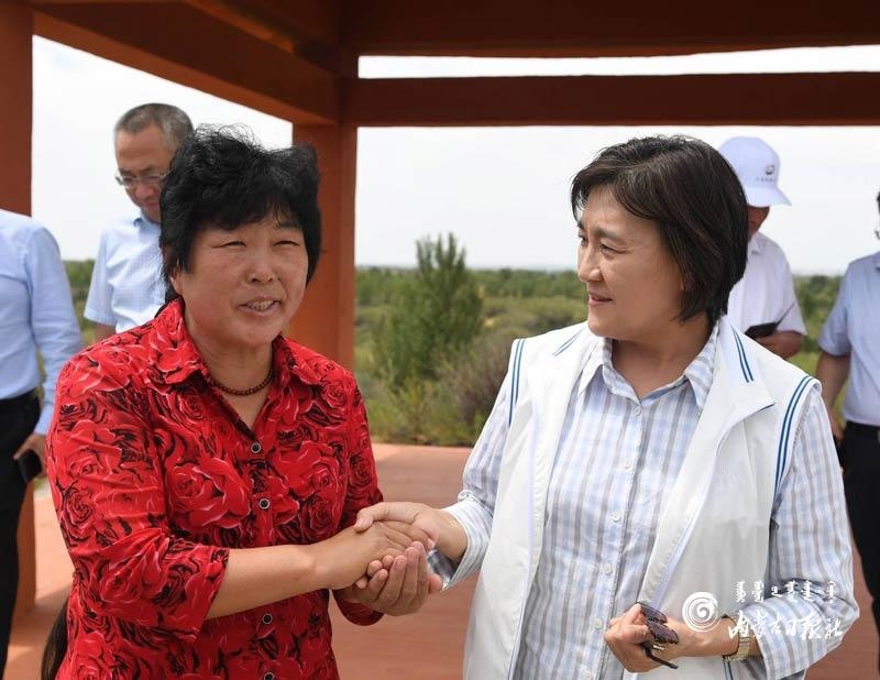 烏蘭陶勒蓋治沙站位于烏審旗毛烏素沙地腹部,建站40多年來,以治沙造林、保護森林資源為己任,一代接著一代干,防沙治沙工作取得了明顯成效。布小林來到烏蘭陶勒蓋治沙站,調(diào)研治沙造林工作,并與全國“三八·綠色獎?wù)隆鲍@得者殷玉珍親切交流,對當?shù)厣鷳B(tài)治理的模式和成效給予肯定。她還來到伊金霍洛旗紅慶河鎮(zhèn),考察鄉(xiāng)村治理、消費扶貧等工作。