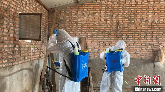 圖為呼斯楞正在跟同事一起為賽因烏力吉家棚圈消毒。 奧藍 攝