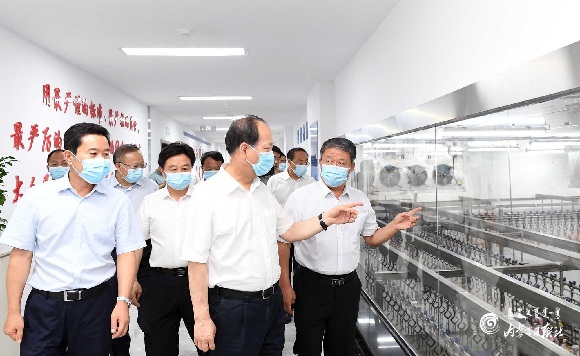 抓項目、興產(chǎn)業(yè)對于做好“六穩(wěn)”工作、落實“六?!比蝿?wù)至關(guān)重要。石泰峰走進金伯利農(nóng)莊、草原宏寶食品公司、金麥提升農(nóng)機裝備制造公司、潤海源肉雞屠宰加工廠、天衡制藥公司等地,深入考察項目推進、企業(yè)經(jīng)營、產(chǎn)業(yè)鏈建設(shè)、供應(yīng)鏈保障等情況。他指出,河套灌區(qū)發(fā)展現(xiàn)代農(nóng)牧業(yè)責(zé)任重大、潛力巨大,要堅持生態(tài)優(yōu)先、綠色發(fā)展鮮明導(dǎo)向,堅持一二三產(chǎn)業(yè)融合發(fā)展,學(xué)習(xí)先進經(jīng)驗,更新發(fā)展理念,創(chuàng)新經(jīng)營模式,提升科技水平,著力推動農(nóng)牧業(yè)向集約化、規(guī)?;?、智能化、高端化方向發(fā)展,切實做好做足現(xiàn)代農(nóng)牧業(yè)這篇大文章。金草原現(xiàn)代養(yǎng)殖園飼養(yǎng)胡羊15萬只,智能化圈舍內(nèi)溫控、噴淋、全自動飲水、電動刮糞裝置一應(yīng)俱全,撒料、消毒等一鍵完成,舒緩的音樂縈繞耳邊。石泰峰指出,像這樣的現(xiàn)代化規(guī)模養(yǎng)殖,不僅能夠有效提高產(chǎn)業(yè)發(fā)展水平和帶動農(nóng)牧民增收,而且有利于解決草畜平衡問題、減少自然放養(yǎng)對草原生態(tài)的影響,要革命性地變革養(yǎng)殖方式,用工業(yè)化的思維和方式推進農(nóng)牧業(yè)發(fā)展,充分發(fā)揮龍頭企業(yè)的引領(lǐng)作用,不斷完善農(nóng)企利益聯(lián)結(jié)機制,實行標準化全流程管理,完善農(nóng)畜產(chǎn)品可追溯體系,推進產(chǎn)加銷一體化發(fā)展,實現(xiàn)產(chǎn)品有市場、質(zhì)量有保證、農(nóng)牧民有收益、企業(yè)有效益。要精心謀劃推進農(nóng)業(yè)和旅游融合發(fā)展,努力把河套大地的特色農(nóng)業(yè)種出好風(fēng)景、種出高效益。他強調(diào),時間就是金錢,時間不等人,各地區(qū)各有關(guān)部門要緊抓施工黃金期,加大力度、加快進度推進各類重點項目建設(shè),有關(guān)方面要全力幫助解決項目推進中遇到的困難和問題,積極主動做好服務(wù)保障工作,促進項目早落地早達產(chǎn),帶動就業(yè)、穩(wěn)定經(jīng)濟。