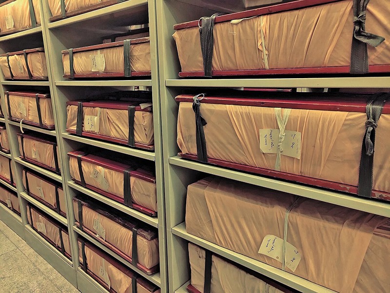 走入蒙古文古籍庫(kù),上萬(wàn)件古籍靜靜地?cái)[放著,在昏黃的特殊燈光照射下,一排排書(shū)架金光閃閃,一個(gè)個(gè)防磁柜就像知識(shí)的巨人并肩站立,歷史在這里塵封,也在這里開(kāi)啟。