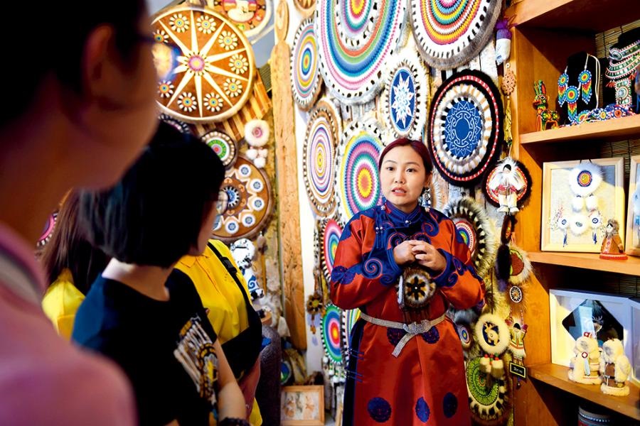 借助自己的鄂倫春族身份,白鵬英成立手工藝坊,組織婦女制作鄂倫春族手工藝品,然后利用網(wǎng)上平臺銷售到全國各地,每個婦女每年平均可增收1000元。