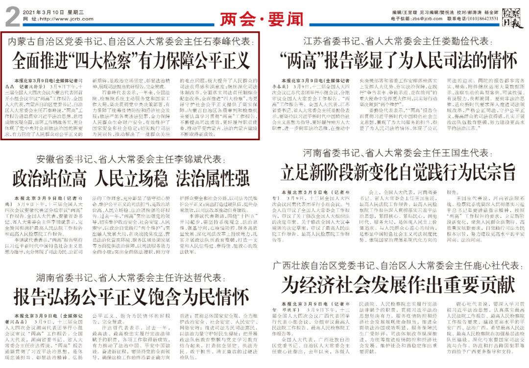 3月10日《檢察日報》第2版——內(nèi)蒙古自治區(qū)黨委書記、自治區(qū)人大常委會主任石泰峰代表:全面推進“四大檢察”有力保障公平正義