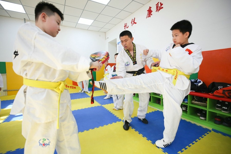 夏學(xué)偉老師正在教同學(xué)們練習(xí)跆拳道 彭瑞誠(chéng) 攝影