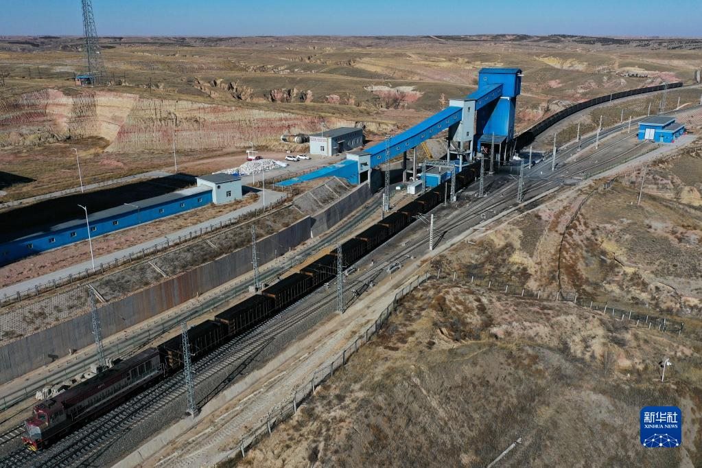 這是11月23日在位于鄂爾多斯市的淮河能源西部煤電集團(tuán)色連二礦罕臺川集裝站拍攝的正在裝煤的列車(無人機照片)。新華社記者李志鵬攝