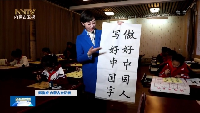 娜格婭 內(nèi)蒙古臺(tái)記者:做好中國(guó)人,寫好中國(guó)字,你能想到我手中的這些字,是一個(gè)四年級(jí)小朋友寫的嗎?我現(xiàn)在是在呼和浩特鋼鐵路第二小學(xué)的興趣課上,學(xué)生們正在學(xué)習(xí)寫毛筆字,一筆一劃傳承書法文化,一撇一捺書寫著愛(ài)國(guó)情懷。像這樣的興趣課每周有一次。