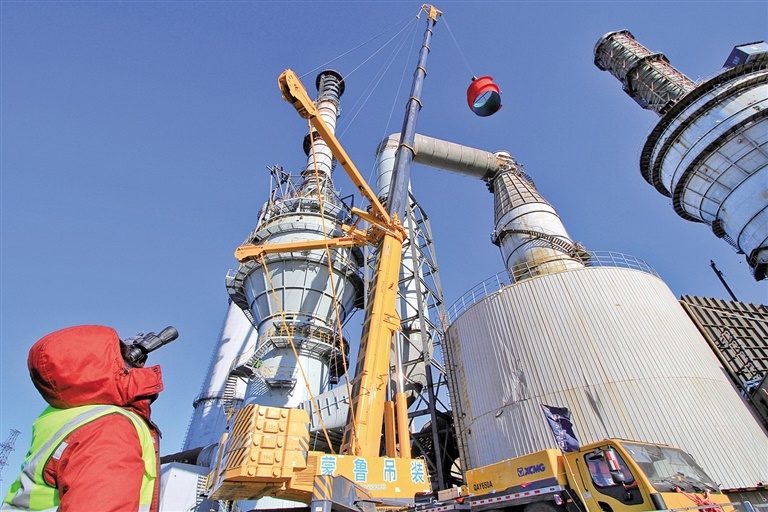 包鋼節(jié)能環(huán)保改造項(xiàng)目——脫硫塔筒吊裝現(xiàn)場。