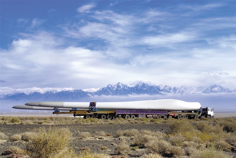 運(yùn)送風(fēng)電葉片的車輛行駛在阿拉善戈壁。馬建荃 攝