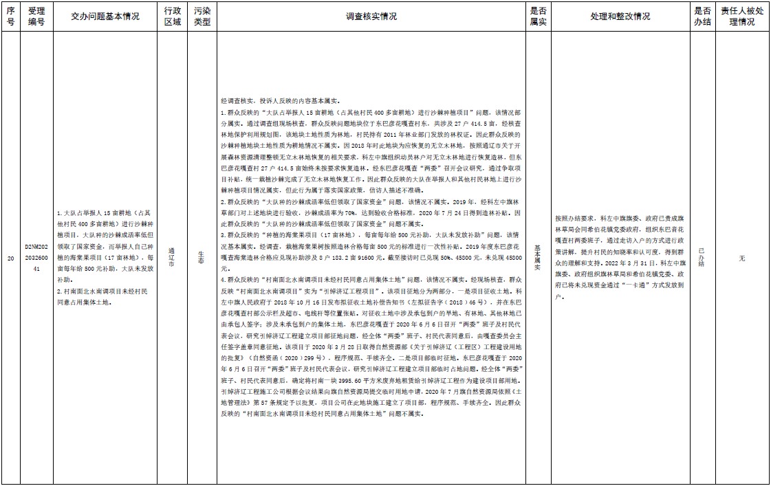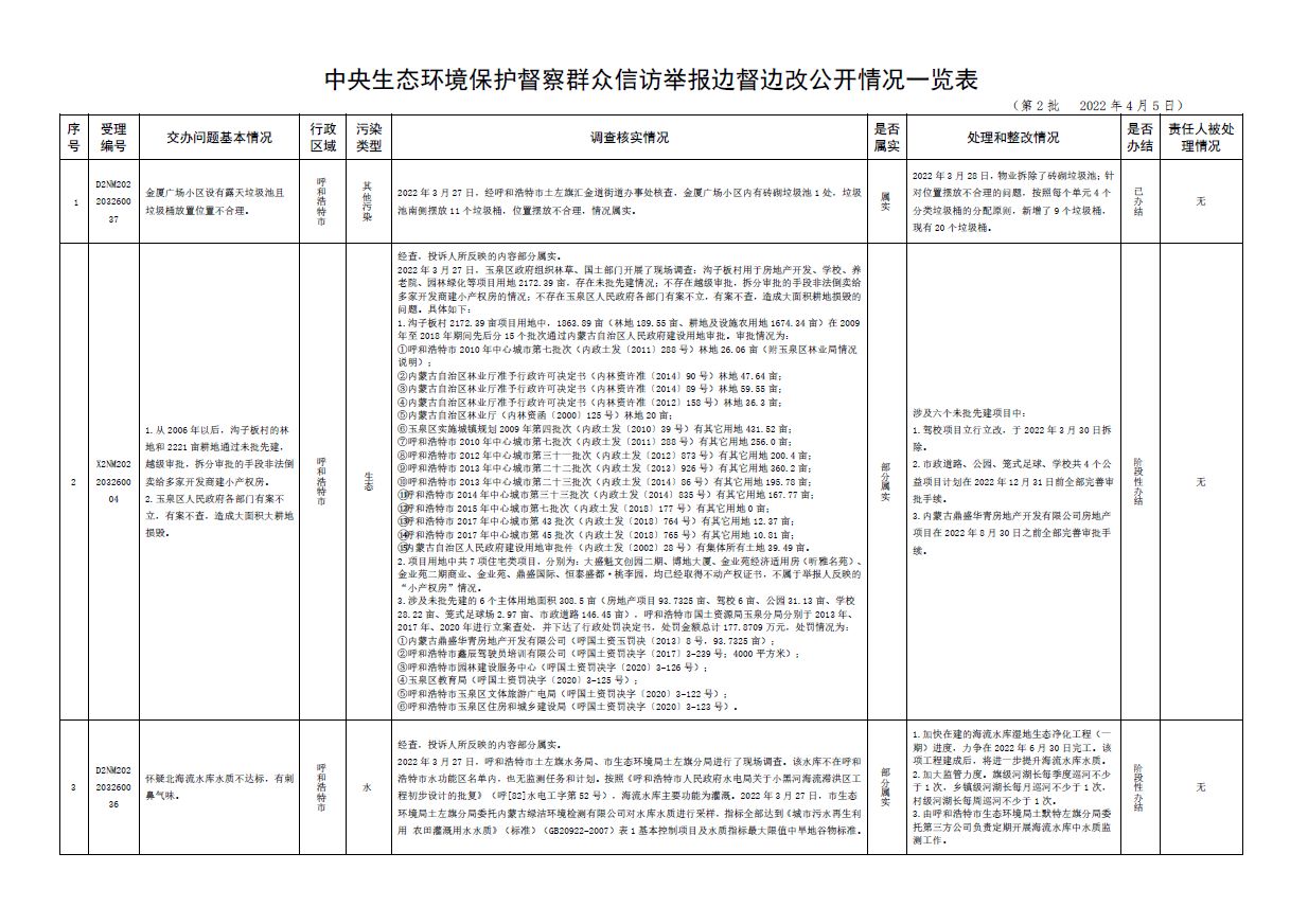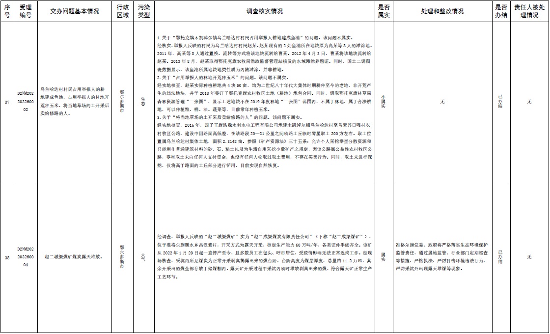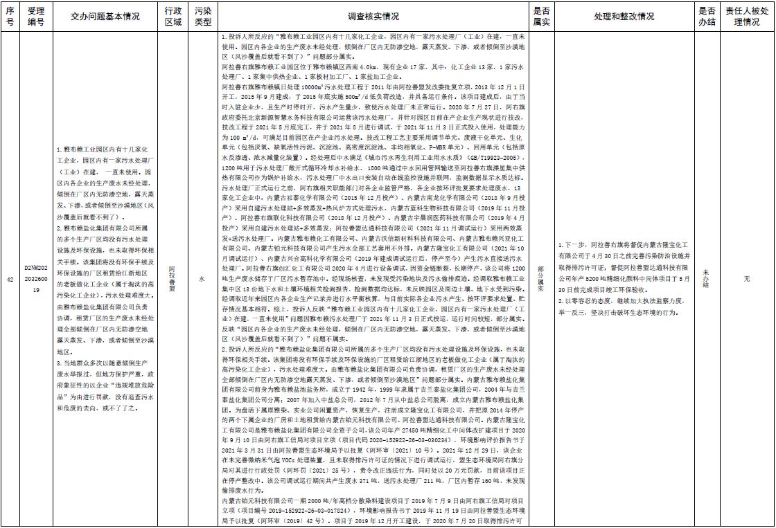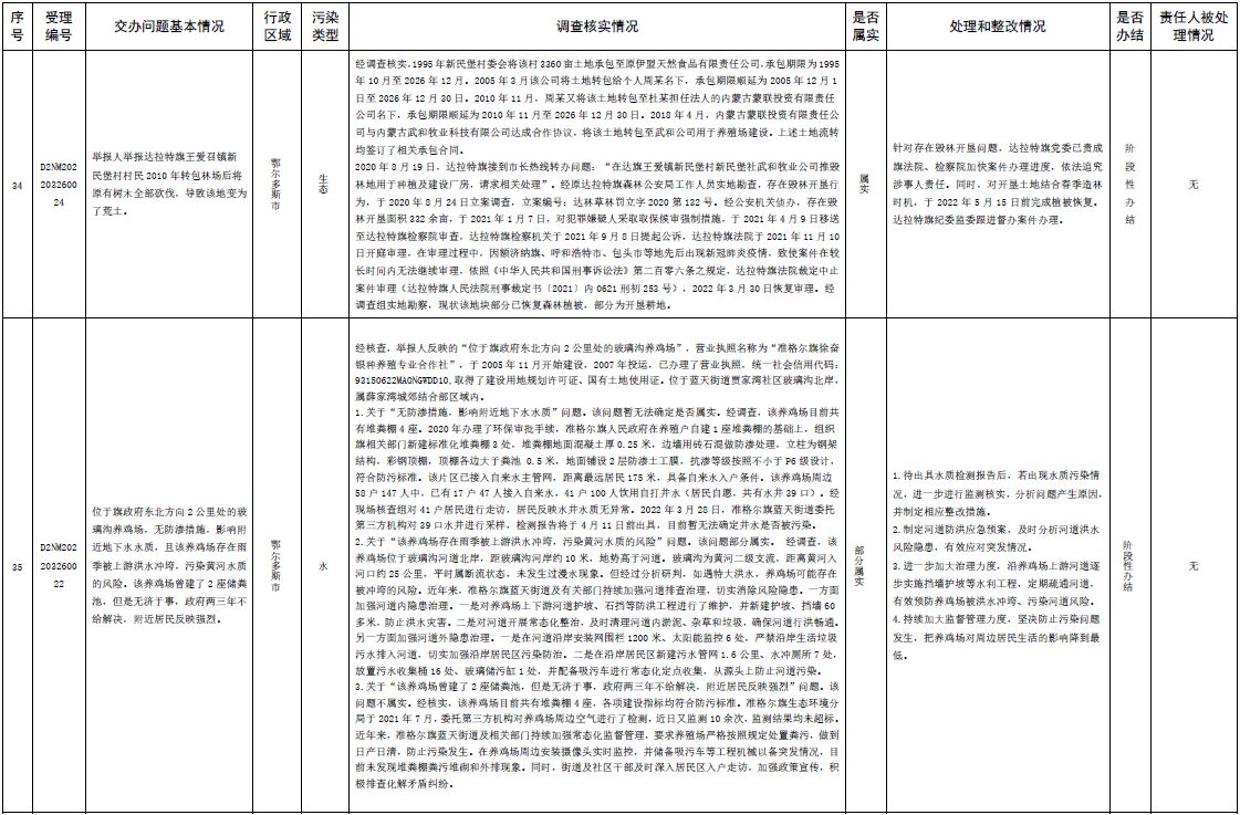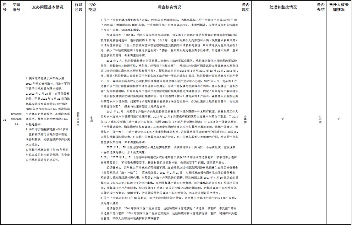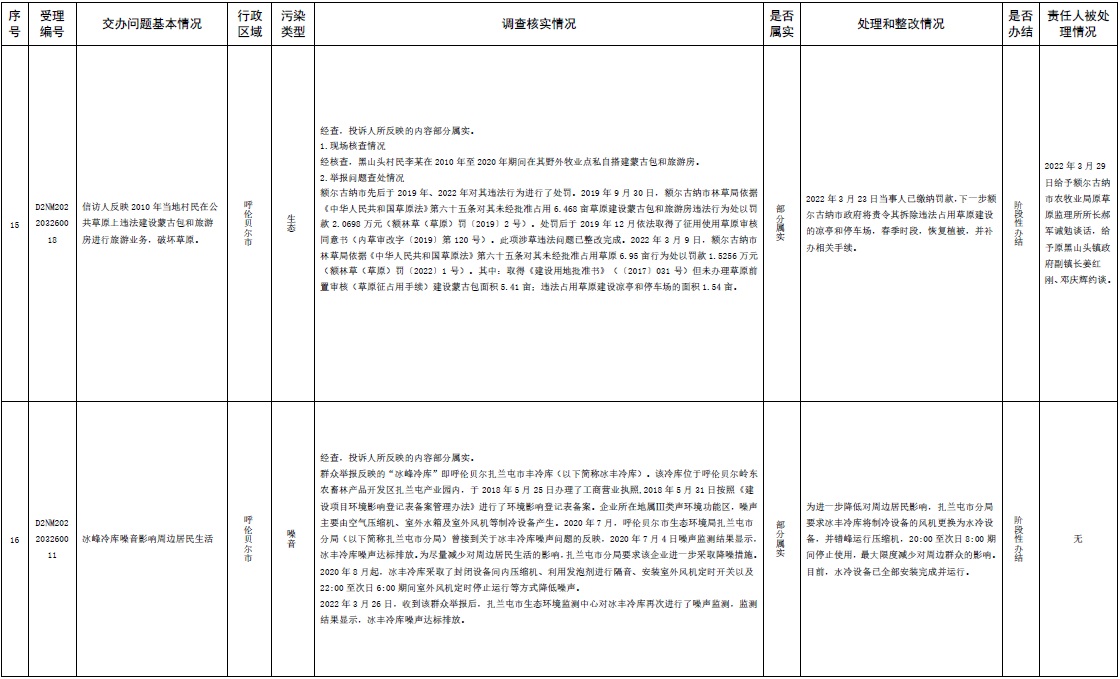 中央第三生態(tài)環(huán)境保護督察組交辦內(nèi)蒙古第二批42件群眾信訪舉報件辦理情況