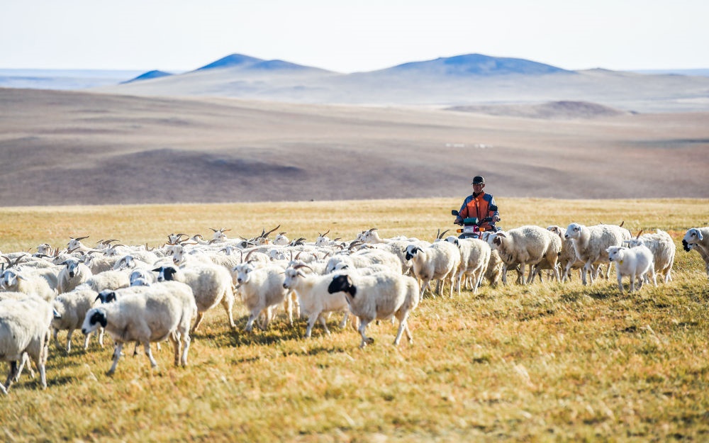 內(nèi)蒙古錫林浩特市寶力根蘇木牧民瑪吉格的兒子鋼蘇格拉在草原上放羊(2017年9月16日攝)。新華社記者連振攝