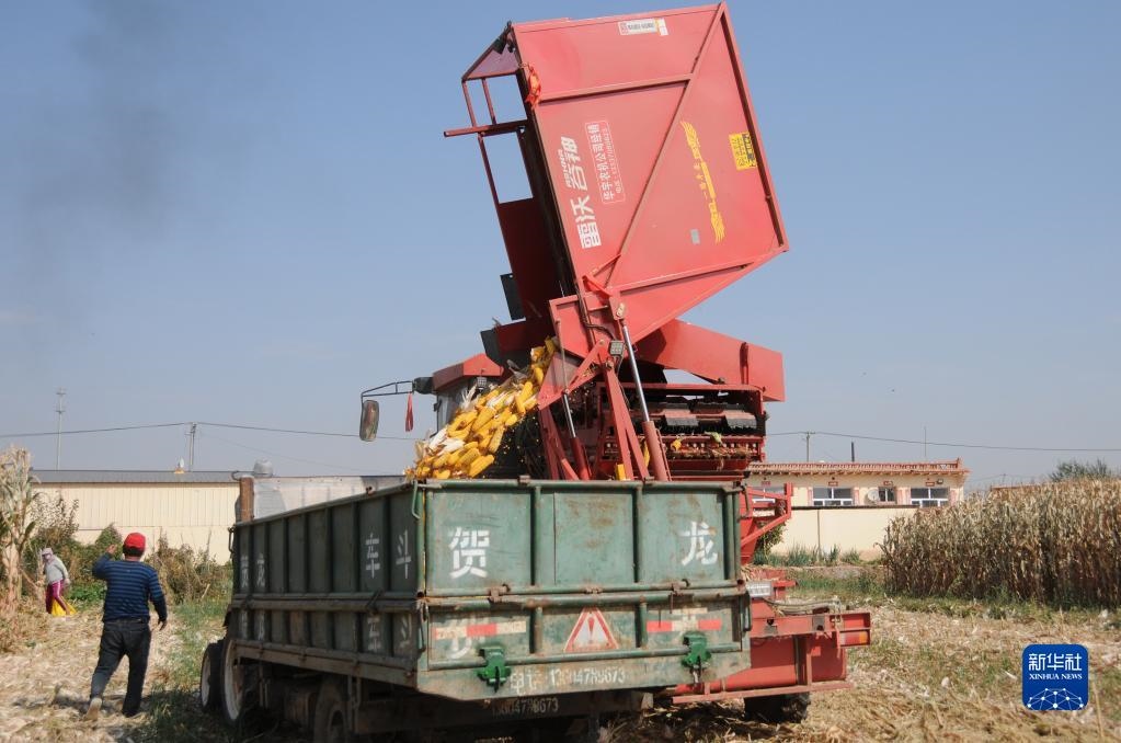 臨河區(qū)干召廟鎮(zhèn)黃濟(jì)村村民收割玉米。(新華社記者李云平 攝)
