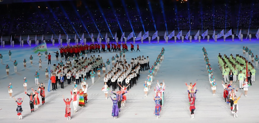 入場(chǎng)儀式結(jié)束后,在雄壯的國(guó)歌聲中,鮮艷的五星紅旗冉冉升起,在體育中心上空迎風(fēng)飄揚(yáng)。期盼的眼神,真摯的祝福,蕩漾在每個(gè)人的心間。開幕式文體展演隨后正式拉開帷幕。