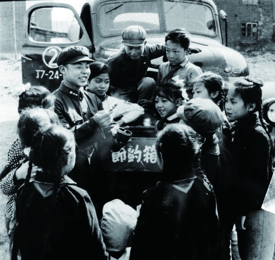 ↑雷鋒(左三)在向戰(zhàn)友們介紹節(jié)油經(jīng)驗。
