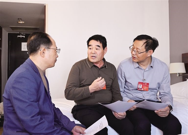 3月4日,住我區(qū)全國(guó)政協(xié)委員阿拉騰達(dá)來(lái)(左)、廷·巴特爾(中)、曹金山(右)在住地,就進(jìn)一步提高草原生態(tài)保護(hù)補(bǔ)助獎(jiǎng)勵(lì)標(biāo)準(zhǔn),為打贏“三北”工程攻堅(jiān)戰(zhàn)和三大標(biāo)志性戰(zhàn)役奠定政策基礎(chǔ)的提案進(jìn)行討論。草原全媒·內(nèi)蒙古新聞網(wǎng)記者 韓卿立 攝