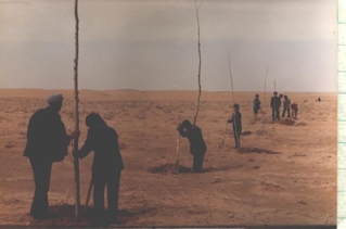 ??“領(lǐng)導(dǎo)都帶頭干,王占文書記包的我們奮勇大隊,帶我們種沙柳。全大隊11個生產(chǎn)隊,排著隊、唱著歌,把紅旗插在各自的沙梁上。民兵也領(lǐng)著娃娃們來種樹,他們掏坑,娃娃遞樹栽子。幾年下來,把奮勇大隊種成了自治區(qū)最早的萬畝林大隊。馮耀華當(dāng)時是公社副書記,包的是阿魯柴登,郭巨才當(dāng)時是公社副主任,包了什里加汗。王占文還專門組織了測繪隊,繪出地圖,統(tǒng)一規(guī)劃,給所有農(nóng)田種上防護(hù)林,定下在哪修路種上行道樹。20年后按圖修路時,施工隊發(fā)現(xiàn),路基兩旁的樹早種好了。”白三寶回憶。