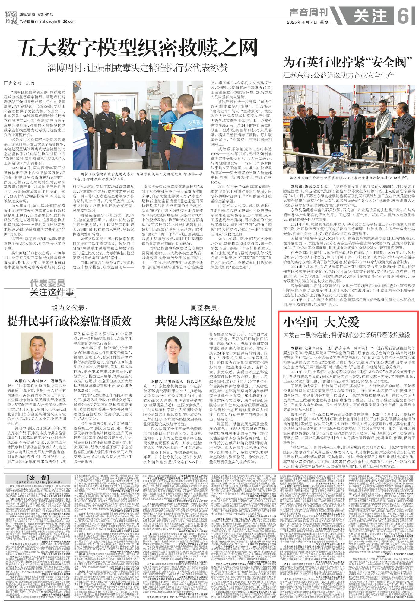 2025年4月7日,《檢察日報》第6版刊發(fā)題為《內(nèi)蒙古土默特右旗:督促規(guī)范公共場所母嬰設(shè)施建設(shè)》的文章,報道了內(nèi)蒙古自治區(qū)土默特右旗檢察院以母嬰室這個群眾身邊的小事為切入點(diǎn),充分發(fā)揮公益訴訟檢察職能,讓婦女兒童的權(quán)益得到切實保障,讓媽媽們感受到全社會的尊重和關(guān)愛。