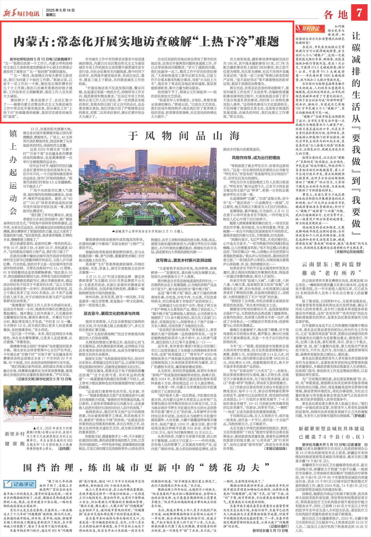 2025年5月14日《新華每日電訊》第7版刊發(fā)了《內(nèi)蒙古:常態(tài)化開展實(shí)地訪查破解“上熱下冷”難題》的文章,報道了內(nèi)蒙古自治區(qū)整治形式主義為基層減負(fù)專項工作機(jī)制辦公室部署開展貫通市縣專項行動,向社會征集有關(guān)問題線索,集中時間下沉到市、縣兩級開展實(shí)地訪查,形成自治區(qū)、盟市、旗縣三級上下聯(lián)動、共同推進(jìn)減負(fù)工作的機(jī)制。